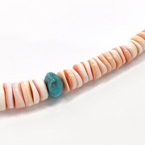 Lovel light coral orange spiny oyster beads mixed with three turquoise stones.