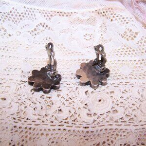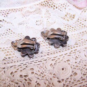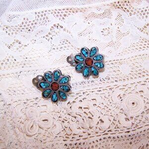 Dating to the 1960s or so, here's a pair of Native American Indian Zuni or Navajo Sterling Silver (tested, not marked) clip earrings featuring a daisy design to the front filled with crushed red coral and turquoise. Fronts measure 5/8" high/wide; combined weight of the pair is 6.6 grams. Clips work as they should. Overall, a nice pleasing design.