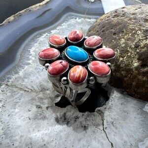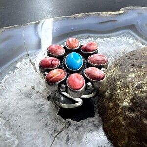 Native American Sterling Silver Turquoise &Spiny Oyster Adjustable Cluster Ring
