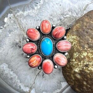 Native American Sterling Silver Turquoise Spiny Oyster Decorated Shank, Adjustable Cluster Ring For Women.