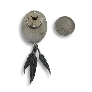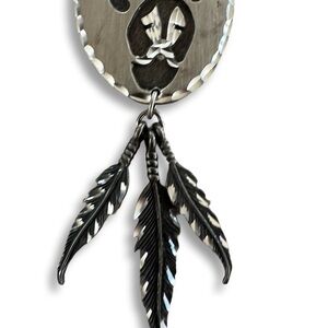 Native American Inspired Elegant silver and black button cover featuring a bear paw design with feather charms. Perfect for adding a unique touch to any outfit.