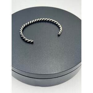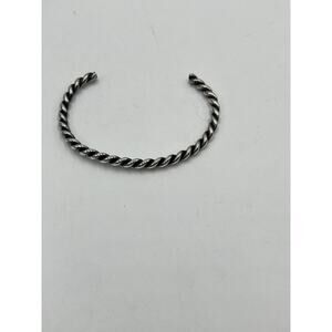 Crafted from sterling silver, this oval-shaped bracelet features a twisted design that adds a unique touch. The bracelet fits a wrist size 6.5 inches and it weighs 11 grams, 3mm wide. The silver color of the bracelet complements any skin tone and the cuff style makes it easy to wear and remove. Not marked but tests as sterling.