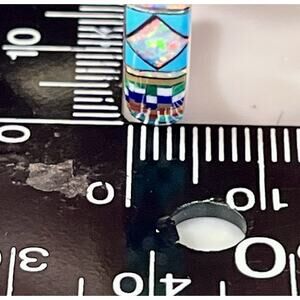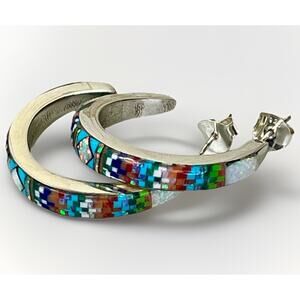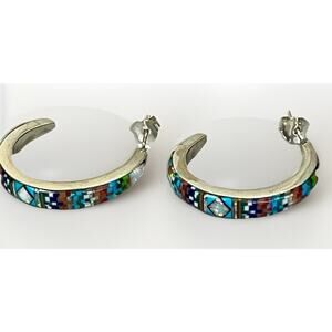 Native American ZUNI Sterling Silver Multi Gem Micro Inlay Hoop Earrings Signed