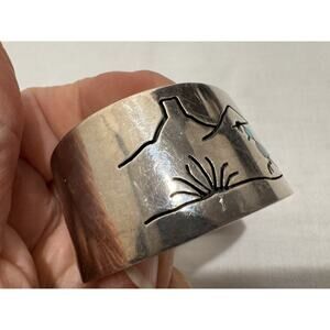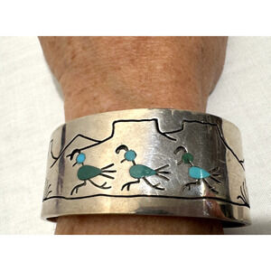 Beautiful inlaid turquoise sterling cuff bracelet with three quail birds and an engraved desert scene.