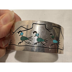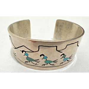 Native American Zuni Sterling Silver Inlay Turquoise Bird Quail Cuff Bracelet 64