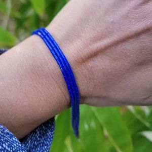 Lovely delicate and dainty bracelet featuring bright blue stabilized lapis lazuli beads handstrung in a triple strand pattern with sterling silver 925 cone caps. Stamped "STERLING" on cones with sun maker's hallmark and "925" on the clasp. Vintage with some natural patina. Price is now FIRM, thank you!