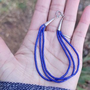Native American handmade hand strung stabilized lapis lazuli three strand sterling silver 925 bracelet