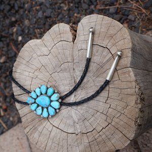Embrace the essence of Native American artistry with our cluster turquoise bolo tie. Handcrafted by skilled artisans, the sterling silver design showcases a mesmerizing turquoise centerpiece, its vibrant blue hues and distinctive matrix patterns capturing the spirit of the Southwest. The braided leather cord adds a touch of rustic elegance, making this bolo tie a timeless symbol of cultural heritage and style.