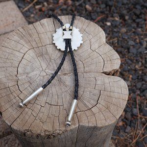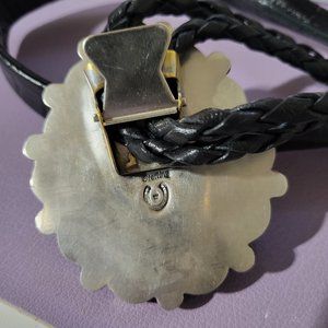 A beautiful Navajo Bolo Tie with Cluster Turquoise Style & leather "Rope" style. Made of sterling silver & Leather with silver tips. Handmade and signed by a Navajo Artisan, Fred Maloney. Traditional tribal artwork, intricate details. Collectible quality Native American jewelry.