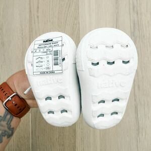 Native Jefferson sneakers for toddlers, size B1 (EU 17/US 2). Color: Pigeon Grey / Shell White. Features flexible knit upper, rubber toe cap, and durable sole. New in box.