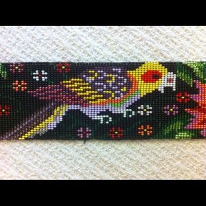 Native Guatemalan beaded parrot belt. 2 Beaded clasps that size to 6 different closures with belt size 40" & tightest closure 37". Hip hugging beaded beauty of 4 different colored parrots between the same pink-red-orange flower. One of a kind.