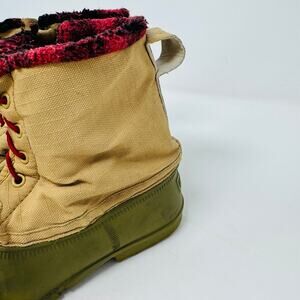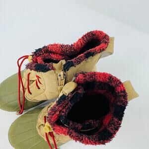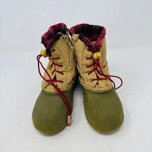 Native boys’ duck boots in size J1. Tan canvas uppers with green rubber shell, red laces, and cozy fleece lining. Waterproof design keeps feet warm and dry, making them perfect for snow, rain, or cold-weather play. Durable and practical everyday winter boots.