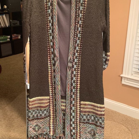 Every woman needs a long cardigan in their closet. This native multi-colored cardigan is a great transitional piece for fall and winter. Style it with your favorite jeans and a tank top.