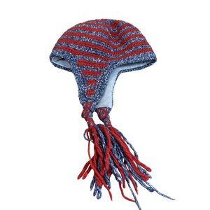This handmade wool earflap hat features a striking red and gray striped pattern, providing both warmth and style. Its thoughtful design ensures coverage for the ears and head, making it well-suited for cold weather. Crafted with care, this hat is an ideal choice for those seeking unique, artisanal winter wear. No defects noted. SKU 9173