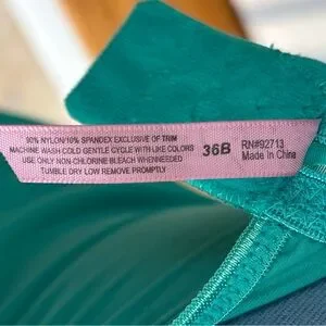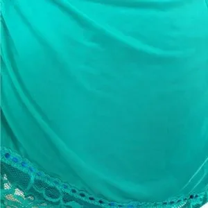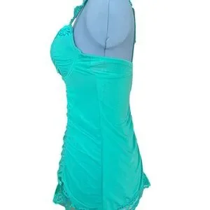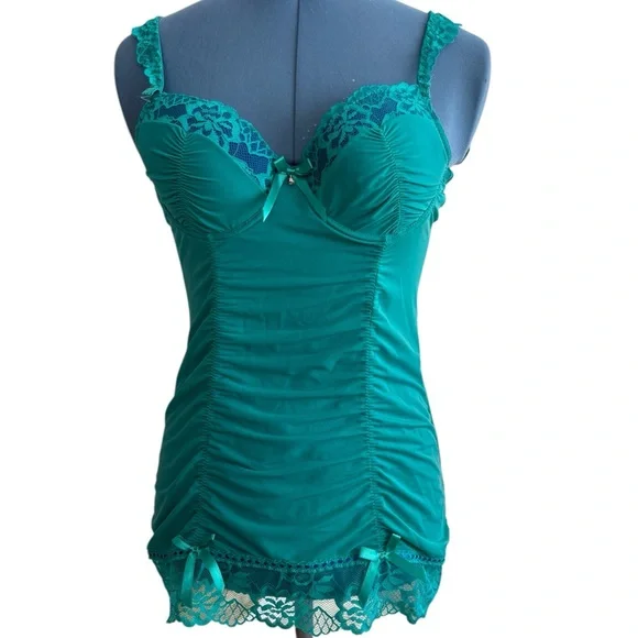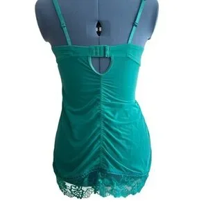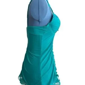 Like new silky turquoise bustier. Adjustable straps and back closure. Ruched front and back. Lace and bow trimmed. Unworn condition with vert small snag on right rear side. Please see pics. Size 36B.
