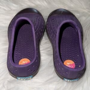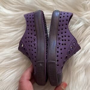 Purple on purple made with Injection molded EVA construction. It is shock absorbent, odor resistant, hand washable, and very lightweight. There are signs of wear but these are in great used condition. Please note the mark on the toe. Otherwise no other flaws or damage.