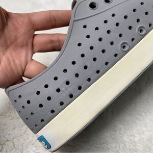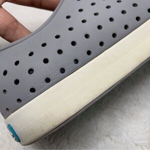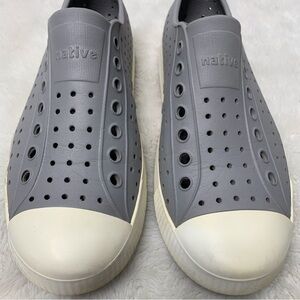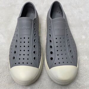 Pre-owned authentic Native Jefferson Men's Gray White Slip On Rubber Slip On Shoes Size 7. Some yellowing in sole and some wear throughout. Please look at pictures for better reference. Happy Shopping! OCT23. TG