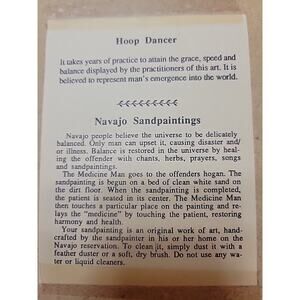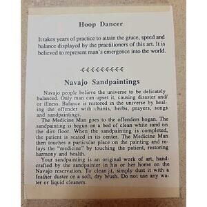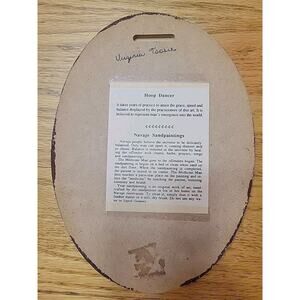 This stunning signed Native American sand art painting depicts a hoop dancer and is created by Virginia Tsosie. The 10 x 7 inch oval piece is unframed and is a perfect addition to any collection. The painting is done with great attention to detail and uses vibrant colors that truly capture the essence of the Navejo culture. Detailed description on back.
