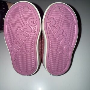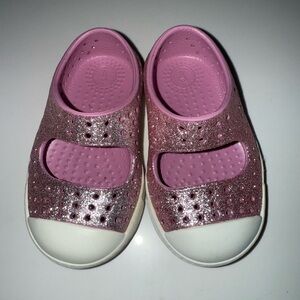 These charming shoes by Native feature a delightful pink and white color scheme, perfect for little walkers. Designed with a secure strap closure and a sturdy white rubber toe cap, they offer both style and functionality. Made from durable materials, they are ideal for the active steps of young explorers.