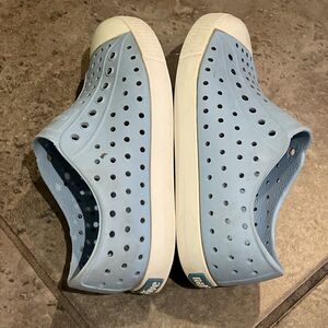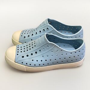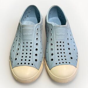 Blue and white, Jefferson, water sneaker, shoes by Native Shoes in an unisex child size C13. Lightweight, waterproof, hand washable, odor resistant. Uppers and insoles in good shape. Soles in great shape with no loss of tread. In great pre-owned condition with minor signs of wear from light use.