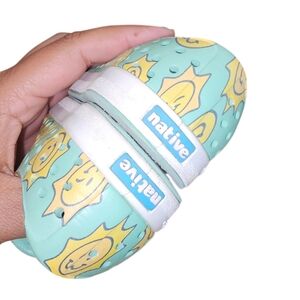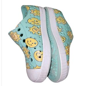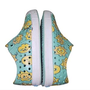 These fun and colorful kids slip-on shoes feature a playful sun design. The aqua and yellow colors make them perfect for any adventure. Easy to wear and comfortable for all-day play.