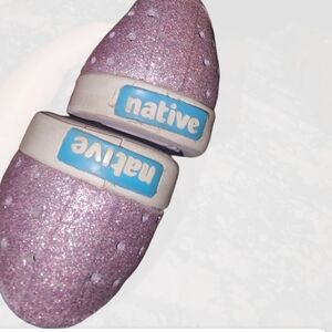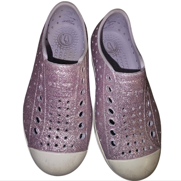 Sparkling slip-on shoes with breathable perforations. Lightweight, water-friendly construction for easy cleaning and all-day comfort. Cushioned insole for soft support. Stylish glitter finish perfect for casual wear.
