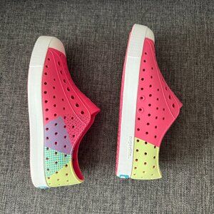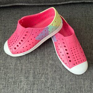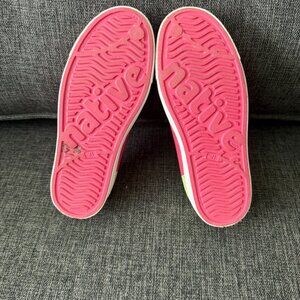 Rubber sole. Pink with a starfish block (Native size J1). Only worn a hand full of times before they outgrew them. No visible markings or flaws on the outside. As always, comes from a smoke and pet free home and 100% authentic.