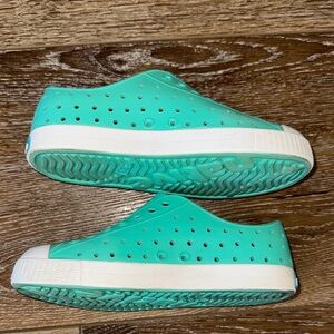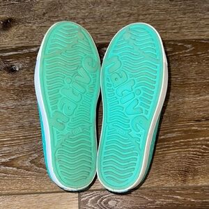 Pool blue color slip-ons with white soles. Lightweight and breathable.