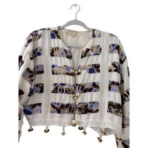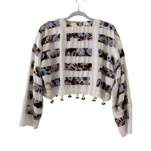 Elevate your wardrobe with this unique cropped jacket featuring an artistic abstract print, tassel embellishments, and Free People's signature boho style. Its lightweight design and soft fabric make it a stylish yet comfortable choice for layering. Perfect for adding flair to casual or festival looks.