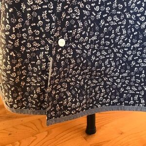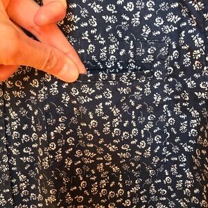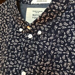 Native Youth Faller Flower woven button down short sleeved shirt in great condition, as pictured. 100% cotton. Designed in England and made in Turkey. Has a Crissman, Blake tag on the inside. Navy blue with white floral pattern. Denim colored piping along the bottom and a cute front pocket.