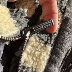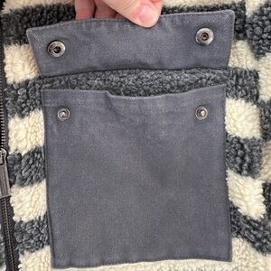 Well made and stylish fleece zip up jacket in like new condition. Features striped pattern with contrasting solid gray canvas pockets. Selected for GQ article highlighting fleece jackets that β€œwon’t make you look like a startup bro.” πŸ™‚ Note: one minor flaw on back β€” a small patch of the wrong color was used on an area about 1/2 inch wide. I was able to remove most of the incorrect fibers to minimize the contrast. Last two pictures show before /after, and second picture (full back view) shows after. Measures 47” chest and 27” length 1353
