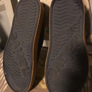 Navy blue with brown sole. Waterproof Native Millers unisex could fit men women or big kids (they were my sons). Men’s size 7 women’s size 9. Really good condition, very little wear