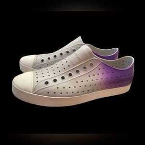 Gray and purple slip-ons by Native. Easy and comfortable fit.