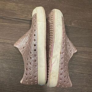 Native pink glitter, rubber, versatile, washable, comfortable slip on shoes. Great for water play or back to school! Minor wear/markings, but plenty of wear left. From a pet and smoke free home.