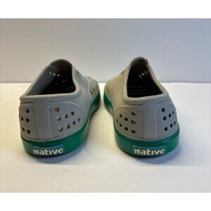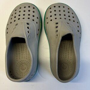 Natives toddler size 9C gray and mint green color. These are in use condition. Treads are good. They’ve been hand washed and air dried smoke free pet friendly home great shoes for play the beach the playground school. They have closed toe and a full-size back but the holes give it lots of breathing room Easy to slip on and off no box as is.