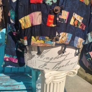 Cool collarless cropped jacket in washed navy blue with patchwork stripes of multicolored patterned batik fabrics across the body and sleeves. Round button closure. Same that dangle from bottom of jacket as design. So cute that they leave strings on some patches as if it was just sewn!