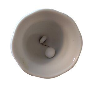 Vintage porcelain bell has Mary, Joseph and Baby Jesus on the front and the rest is white with gold trim detailing. It measures approximately 5 inches tall.