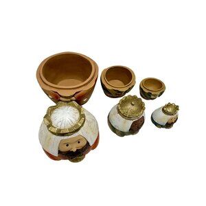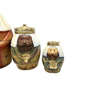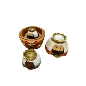 Vintage nativity scene nesting dolls set featuring the 3 Wisemen. The tallest is 5.75" with a small chip on the back. Ideal for collectors and holiday decor.
