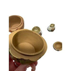 • Tallest doll 5.75" and has a chip on back, see photos. 3.75" interior tiny chip and 2.75" tall