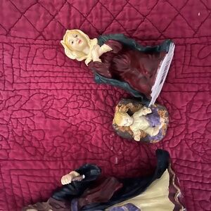 Purchased by my mom in Colfax, WA in appx. 2015. Never used. Each pice is appx 8" long. The entire set fits into a USPS large priority mail box. The only damage is to two of the wise men's hands, which I only noticed when I was setting them up for photos