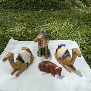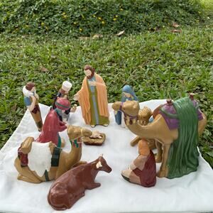 These sets are typically hand-painted and include figures representing the Nativity scene, such as Mary, Joseph, baby Jesus, the Three Kings Wise Men, shepherds, and various animals like camels, and cow.