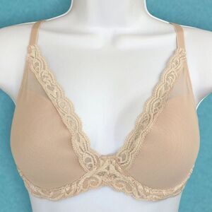 Natori Feathers Lightly Padded Underwire Plunge Beige Cafe Bra 32DD 32E NWOT