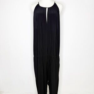 Elevate your lounge or resort look with this effortlessly chic black jumpsuit from Natori. Designed in a lightweight stretch knit, this sleeveless one-piece features a gathered neckline with front keyhole detail, adjustable drawstring waist, and relaxed wide-leg silhouette. Brand new with tags and made for comfort with a flattering drape.