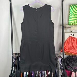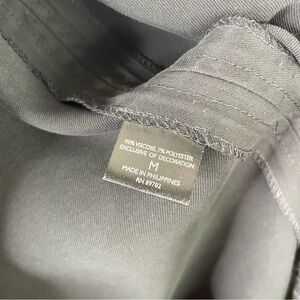 Size medium. Sleeveless. Zip up back. Does not stretch. Very lightweight, no lining. Side pockets. Viscose & polyester blend.