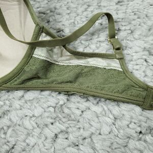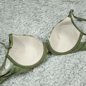 Women's Natori Bliss Perfection Comfort Contour Underwire Bra in green "Sage Camo". Style number 721154. Has some wear/stretching on the band as shown in photos and fading on the inside of the straps as shown in photo. Size 34C.