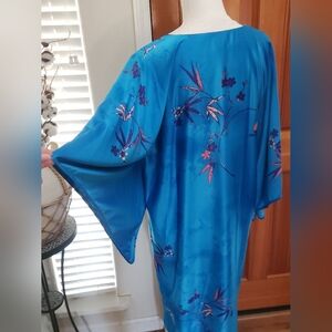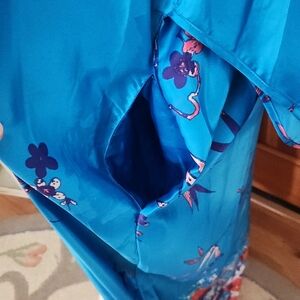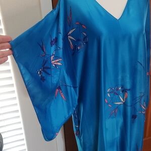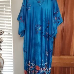 Elegant blue dress with purple floral accents. VNeck, bell sleeves, and side pockets. Perfect for any occasion.
