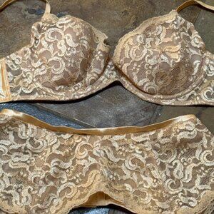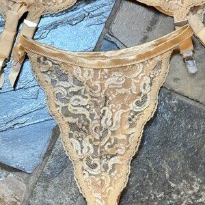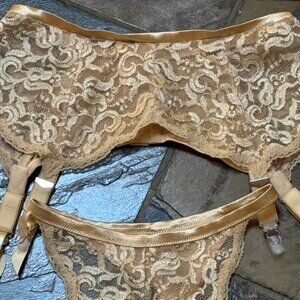 Natori gold lace underwire bra (36C), thong panty (Small) and Suspender Garter belt (Medium) lingerie set