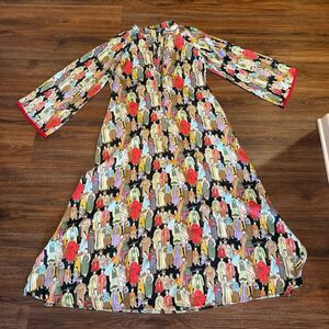 Long caftan boasts an intricate Asian-inspired dynasty print.