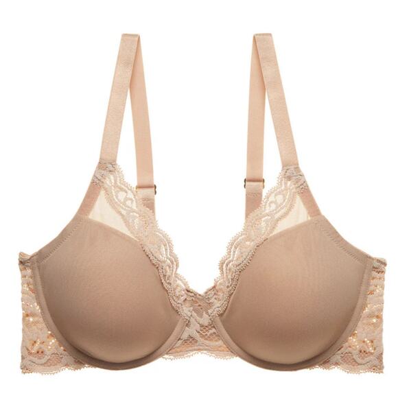 *NEW WITHOUT TAGS* The Natori Feathers bra is a best seller for its lightweight feel and amazing support. The contour underwire cups provide a smooth, natural shape, while the delicate lace wings add a touch of elegance. The Cafe color is a versatile neutral that will disappear under any top. You'll love how confident and comfortable you feel in this bra!