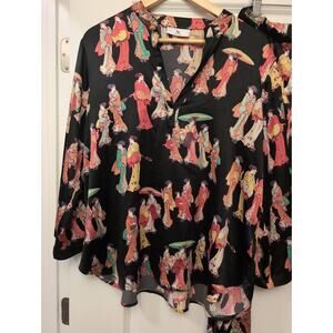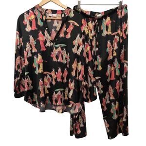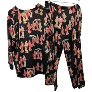 Natori Geisha-Printed Satin Pajama Set Black Multi Sleepwear 2 Pcs Lounge Luxe